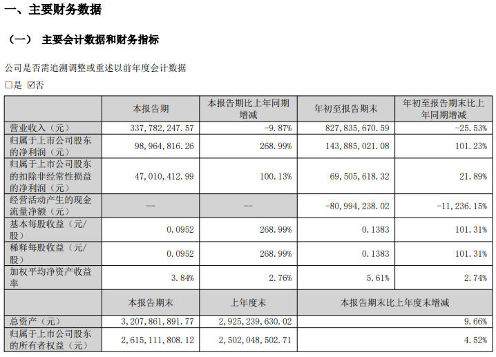 三川智慧披露财报显示,前三季度,公司实现营收8.28亿元,同比降25.53%;实现净利润1.44亿元,同比增101.23%。第三季度,公司实现营收3.38亿元,同比降9.87%;实现净利润9896.48万元,同比增268.99%。