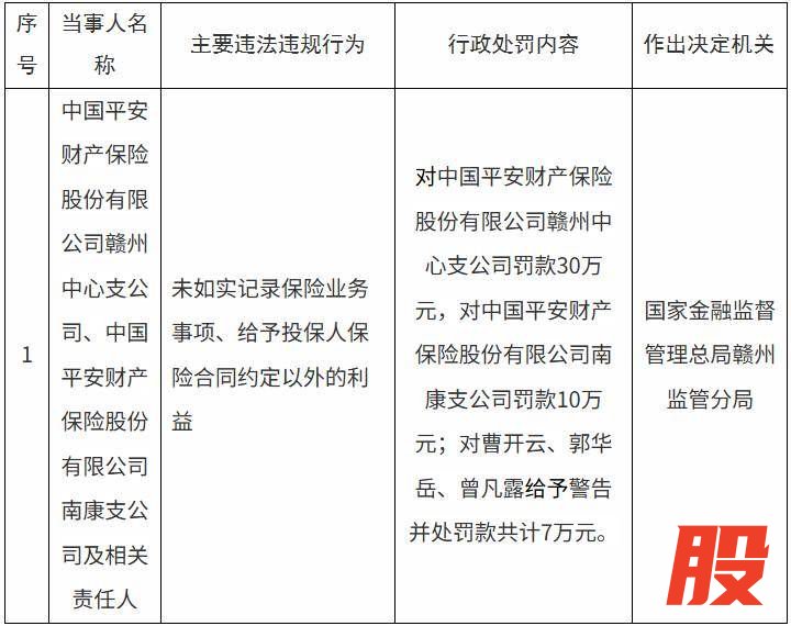 2025年12月30日,国家金融监督管理总局赣州监管分局披露的行政处罚信息公开表显示,中国平安财产保险股份有限公司(以下简称“平安财险”)赣州中心支公司、平安财险南康支公司因未如实记录保险业务事项、给予投保人保险合同约定以外的利益,被分别罚款30万元、10万元。同时,相关责任人曹开云、郭华岳、曾凡露分别被给予警告并被处罚款共计7万元。
